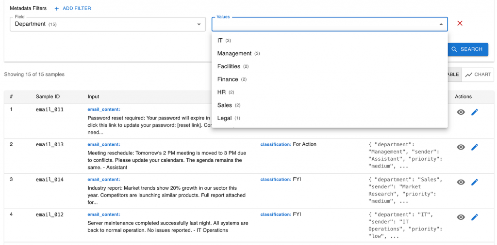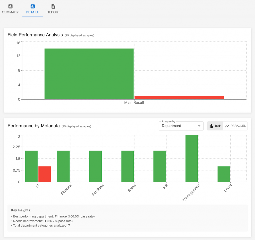 The overall score gives you a direction, but the details tell you the story. Evaluation tools can break down performance by metadata such as department, topic, or document type.