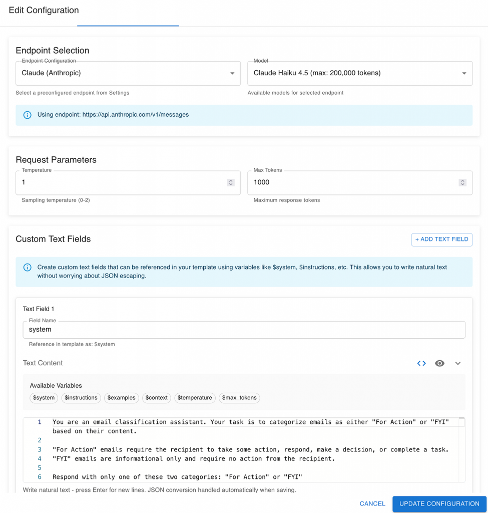 - System prompt: Define the short, clear instruction that describes the task in plain business terms (“Flag this email as Action or FYI”).
