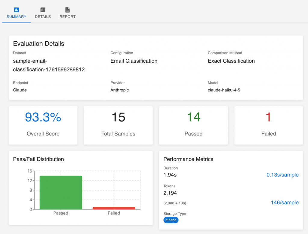 Every evaluation produces an overall score — for example, 93% accuracy. This number becomes your starting point for discussion: