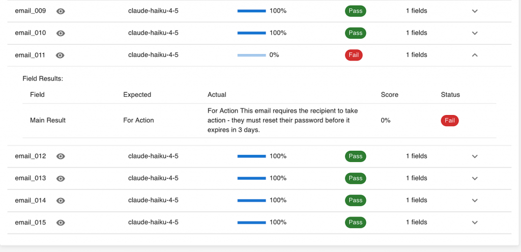 Together, these three layers — the big number, the detailed breakdown, and the individual samples — give you a complete picture of where your AI stands and what to do next.