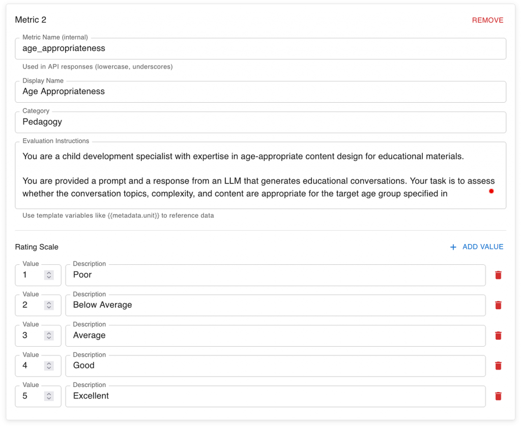 In the example below (screenshot), we define a metric called Age Appropriateness, used to assess content generated for children.