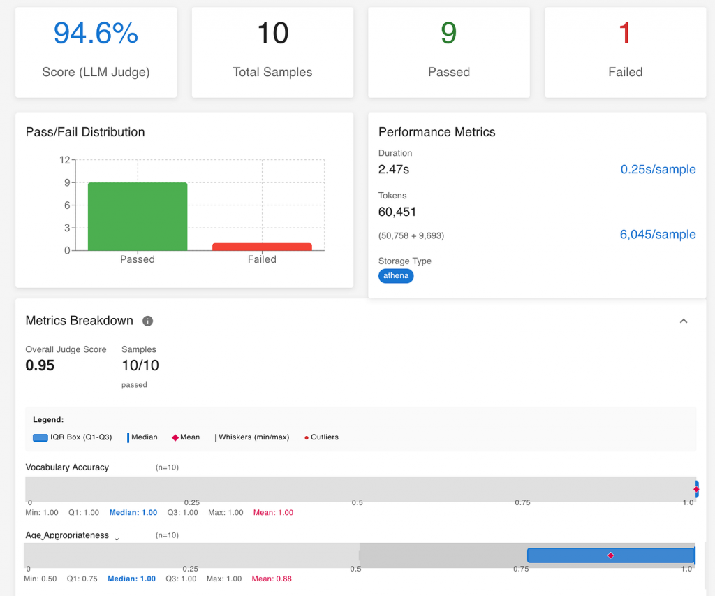 In the screenshot, for example, we can see separate scores for Vocabulary Accuracy that scored 1.0 and Age Appropriateness that scored 0.88. It means the generated responses were linguistically correct and almost perfectly suitable for the target age group.