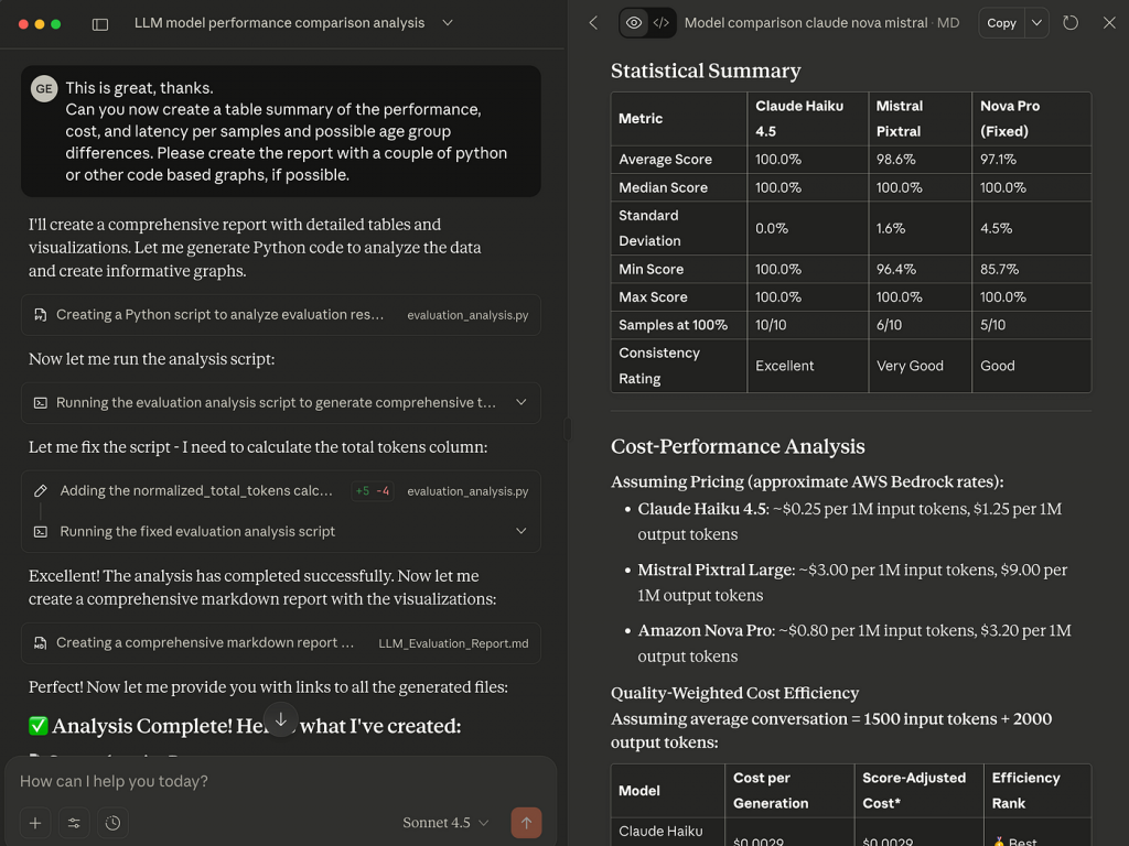 In the example above, a secure Claude Desktop data connector was used to analyze multiple evaluation runs. The AI automatically generated a detailed markdown report with tables, charts, and commentary — exactly like what a skilled analyst would produce, but in minutes rather than days.